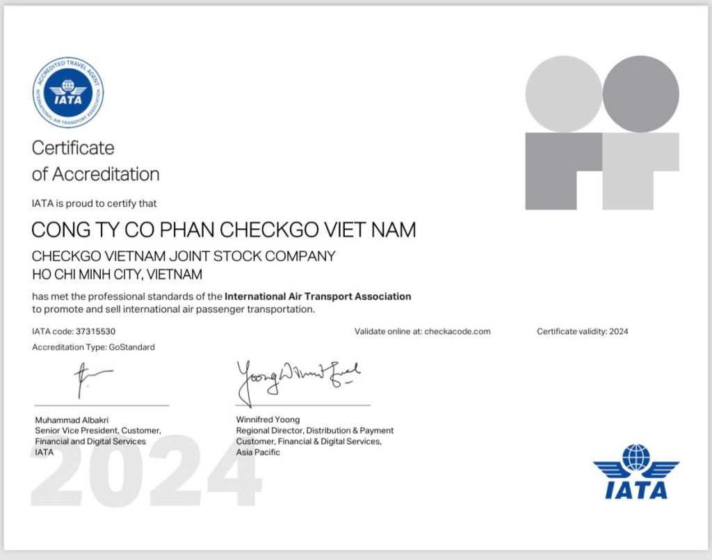 CheckGroup tự hào là đơn vị được cấp chứng nhận IATA (International Air Transport Association) – Hiệp hội Vận tải Hàng không Quốc tế. Đây là tiêu chuẩn uy tín nhất trong ngành hàng không toàn cầu, chỉ dành cho các tổ chức đáp ứng đầy đủ những yêu cầu nghiêm ngặt về: